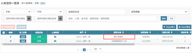 此外,若與內外部教育訓練結合,便可將這些訓練內容設定成不同的證照,在人事升遷上,便可直接查詢該人員升職時,是否擁有該職位受過相關訓練或具備相關證照。