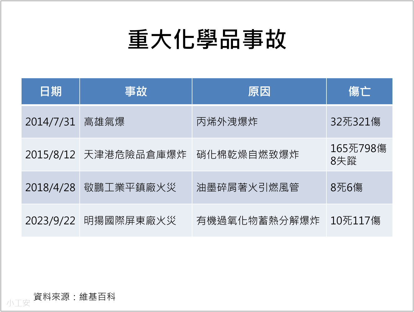 例如:2014/7/31的高雄氣爆,造成32死321傷;以及因為硝化棉乾燥自燃引起爆炸,造成165死798傷8失蹤;2018年敬鵬工業平鎮火災,因為油墨碎屑著火引燃風管,造成8死6傷;2023年9月22日的明揚國際屏東廠火災,由於有機過氧化物蓄熱分解爆炸,造成10死117傷的重大悲劇。