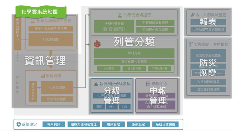 多樣的化學品資訊、不一樣的判定邏輯、不同的後續管制作為,再加上日漸嚴格的稽核標準,要單靠人工落實化學品管理是十分困難的,故使用數位系統輔助管理,已是全球管理上的最新趨勢。一個好的化學品管理系統,便要可解決管理中所面對的5大挑戰,因此系統需要具備協助「資訊管理」、「列管分類」、「分級管理」、「申報管理」、「防災應變」、「報表/統計」的多樣功能。