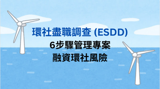確認專案可融資性之外,執行環社盡職調查的主要目的是確保專案符合相關綠色金融標準,包括赤道原則(Equator Principles)、國際金融公司環境與社會永續績效標準(International Finance Corporation Performance Standards on Environmental and Social Sustainability)、世界銀行環境健康安全指南(World Bank Environmental, Health, and Safety Guidelines),以及當地的環社法規。