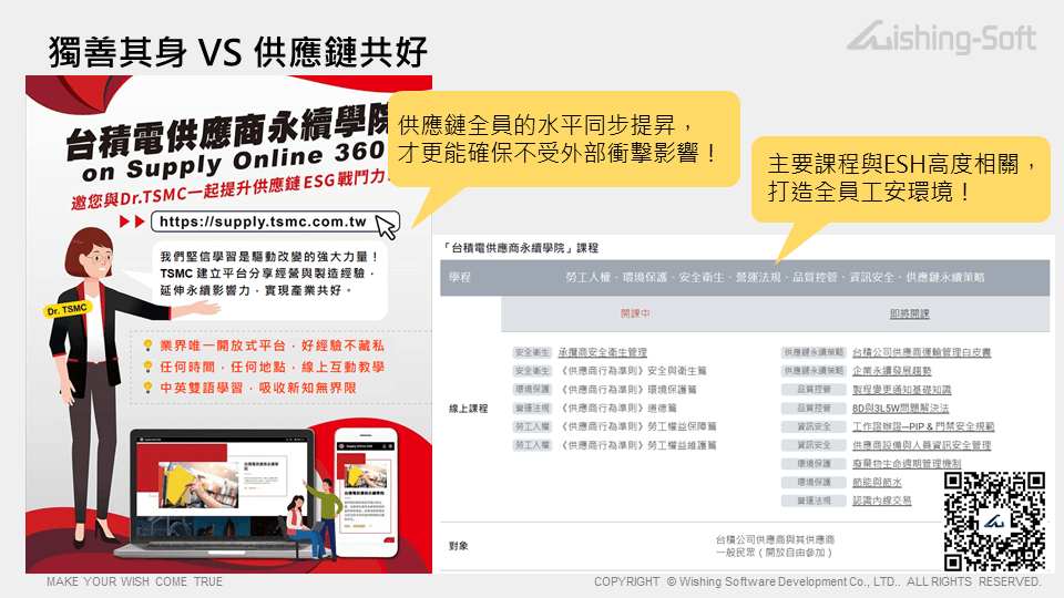 舉例來說,像半導體業的領頭羊台積電,近年就加大了供應鏈共好具體作為的力道,尤其在衛安衛相關領域提供了大量的課程資源給供應鏈夥伴,希望打造全員工安的環境,一起提升供應鏈的ESG戰鬥力。