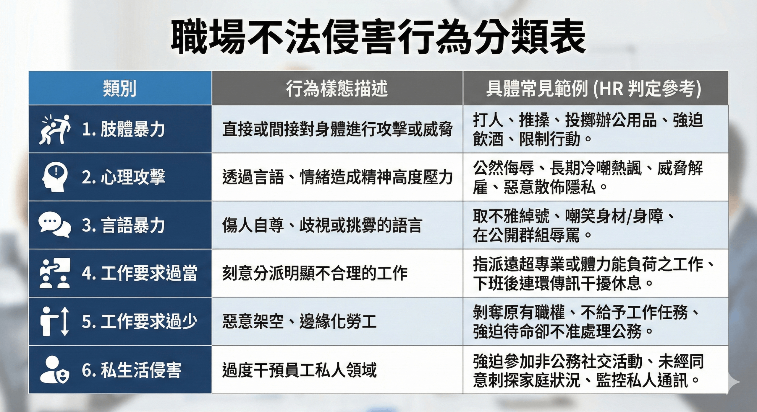 依據勞動部《執行職務遭受不法侵害預防指引》,主要可歸類為以下六大類。人資應將此表製作成內部公告,提升全員識覺。