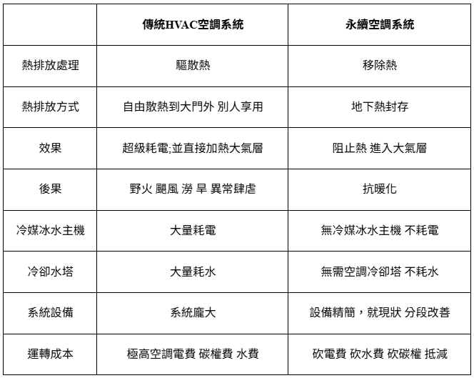 有別於傳統HVAC空調系統,「永續空調」專利新工法,可積極改善傳統空調系統用電,大量減少由電轉熱的熱排放,並從發熱源頭「熱收集、熱捕捉、熱封存」,熱排放不再進入大氣層,另一方面大量減少傳統空調系統用電需求,就是減少發電廠發電量,就是減少碳排放,抗暖化。